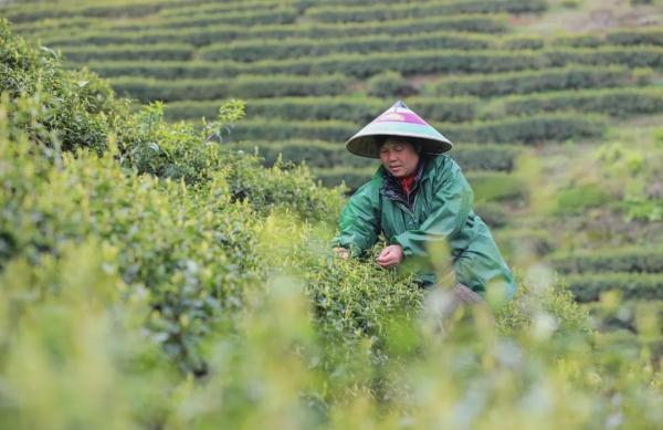 江西万安县茶农在采摘明前茶。邱哲摄